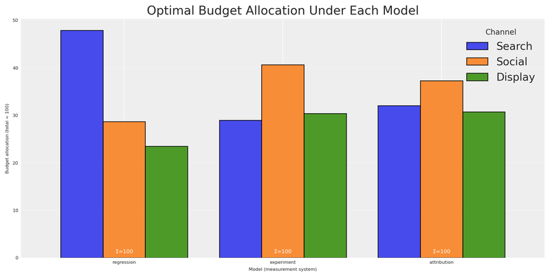 You look at your measurement systems. The regression model says search is a star — high incremental return, pour more money in. A recent experiment says social outperformed search by 3x during last month’s geo-test. Meanwhile, the attribution dashboard reports that display drives more contacts per dollar than any other channel.