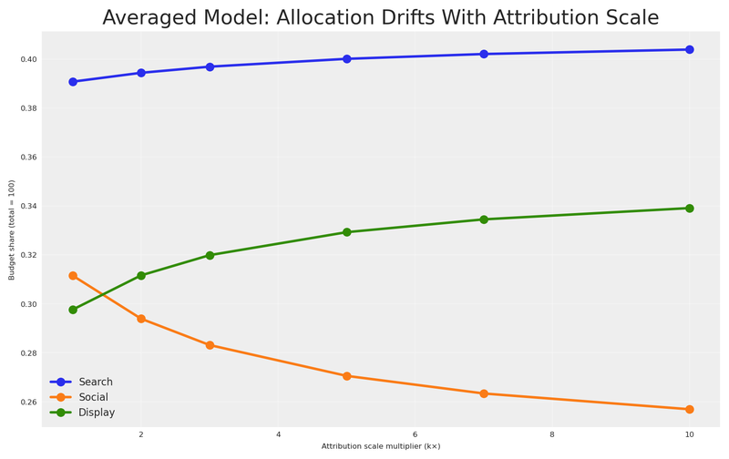 BudgetOptimizerto find the optimal allocation under each view. This gives you the candidate allocations and the V^*(m) benchmarks. - Merge the models with