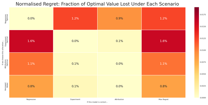 BuildMergedModelso all views share a singlechannel_datainput — one computational graph, every response surface accessible. - Compute the normalised regret matrix by cross-evaluating every allocation under every model.