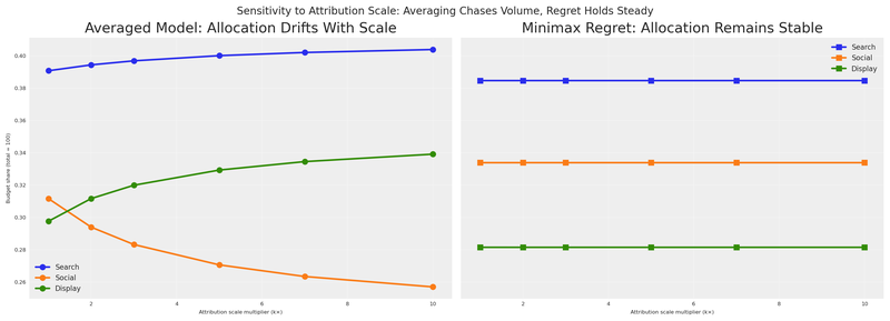 Scale asymmetry breaks naive aggregation. When measurement systems operate at different scales — as they invariably do in practice — averaging lets the loudest system dominate. The sensitivity analysis confirms that averaged-model allocations shift dramatically as one model’s scale changes by an order of magnitude, while minimax-regret allocations remain stable.