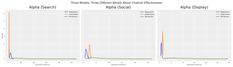 # print(f"Total budget: {TOTAL_BUDGET}")Here’s where the disagreement lives. Each measurement system has different beliefs about the saturation parameters (\alpha, \lambda) for each channel. Critically, they disagree about the channel ranking — and they disagree about the scale of marketing effectiveness.
